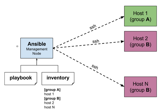The management node in the above picture is the controlling node (managing node) which controls the entire execution of the playbook. Its the node from which you run the playbook. The inventory file provides the list of hosts where the Ansible modules needs to be run and the management node does a SSH connection and executes the small modules on the hosts machine and installs the product/software.